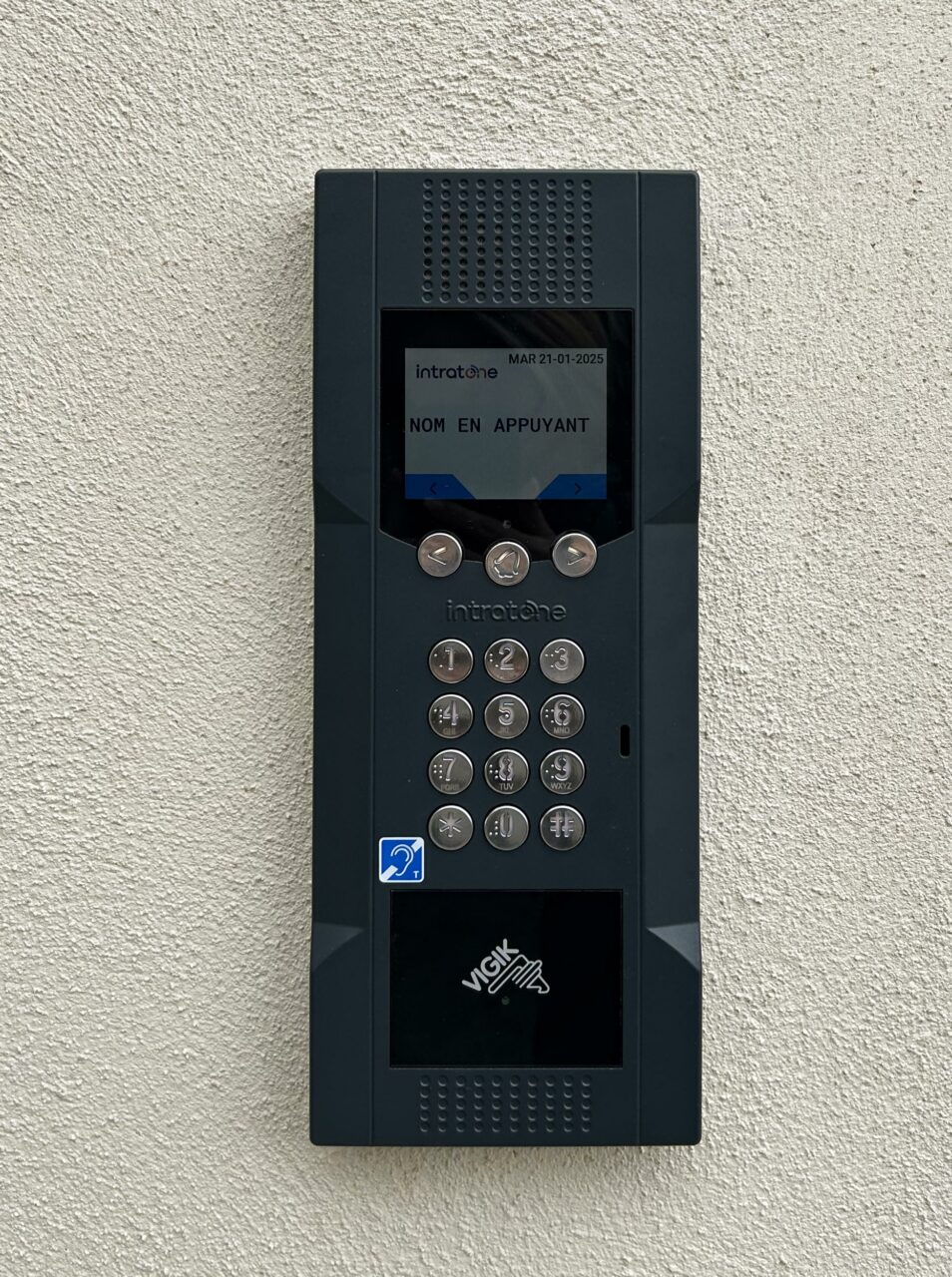 C’est un poste extérieur doté d’un interphone vidéo (caméra + micro), souvent complété par des fonctions d’accès (badge, digicode, accès à distance) qui permet :